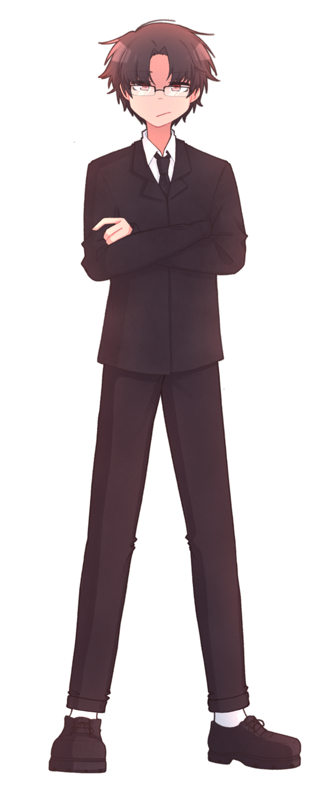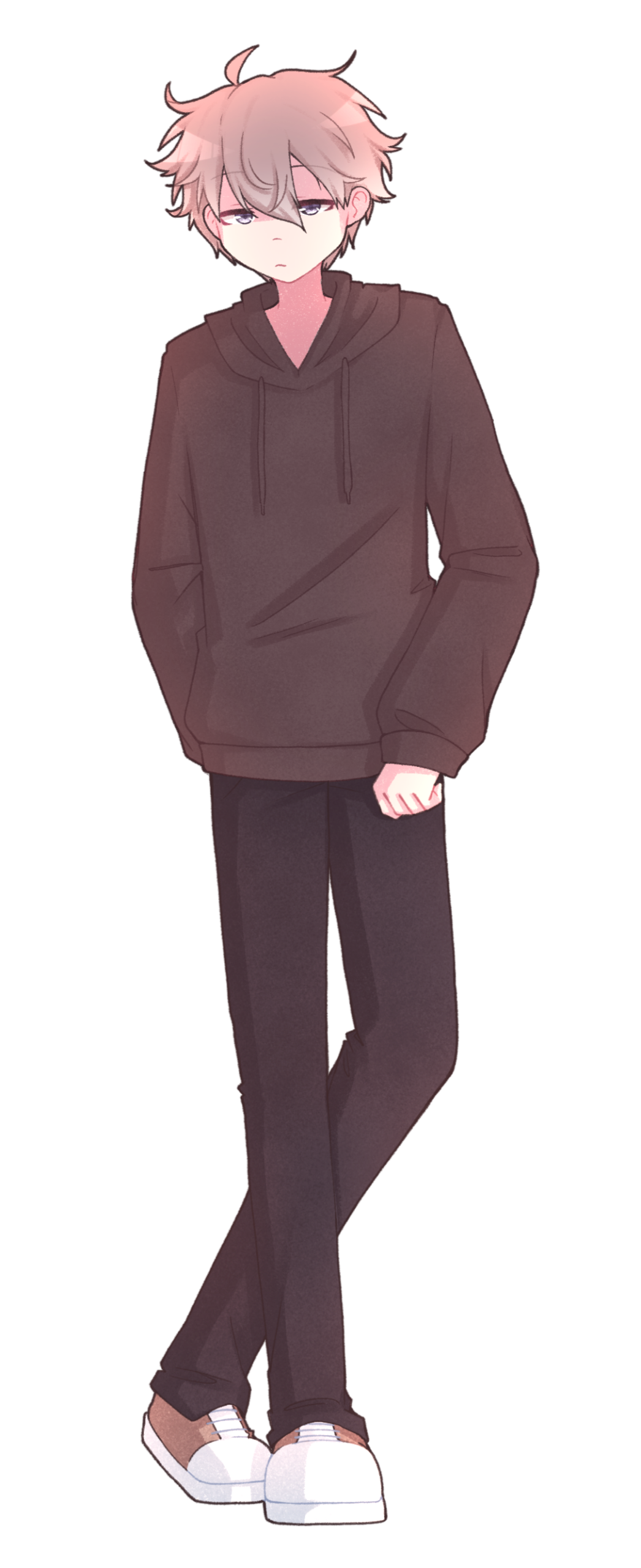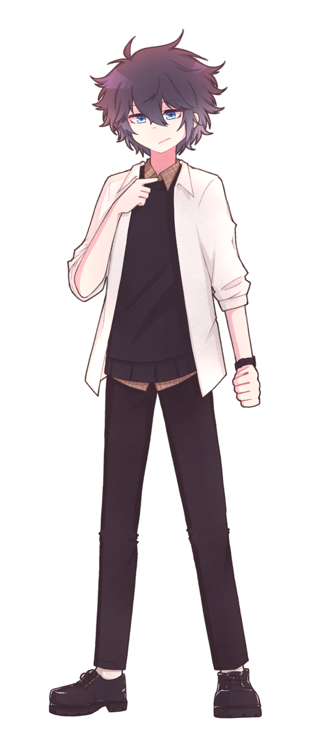 Shou est un jeune homme au regard bleu clair, souvent perdu dans ses pensées avec un air calme et détaché. Ses cheveux noirs, un peu décoiffés, retombent naturellement sur son front, ce qui accentue son allure nonchalante et rêveuse.Son style vestimentaire est élégant et soigneusement choisi, contrastant avec son attitude décontractée. Il privilégie les chemises et les pantalons ajustés mais aussi des cardigans aux lignes simples. C'est un look naturellement chic et propre qui montre qu'il prend soin de lui, même sous ses airs désintéressés.