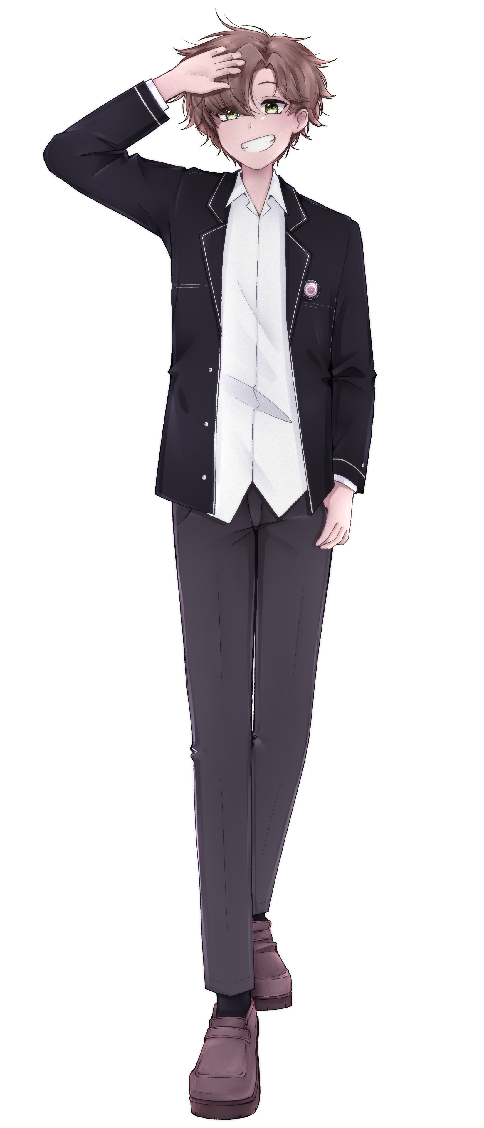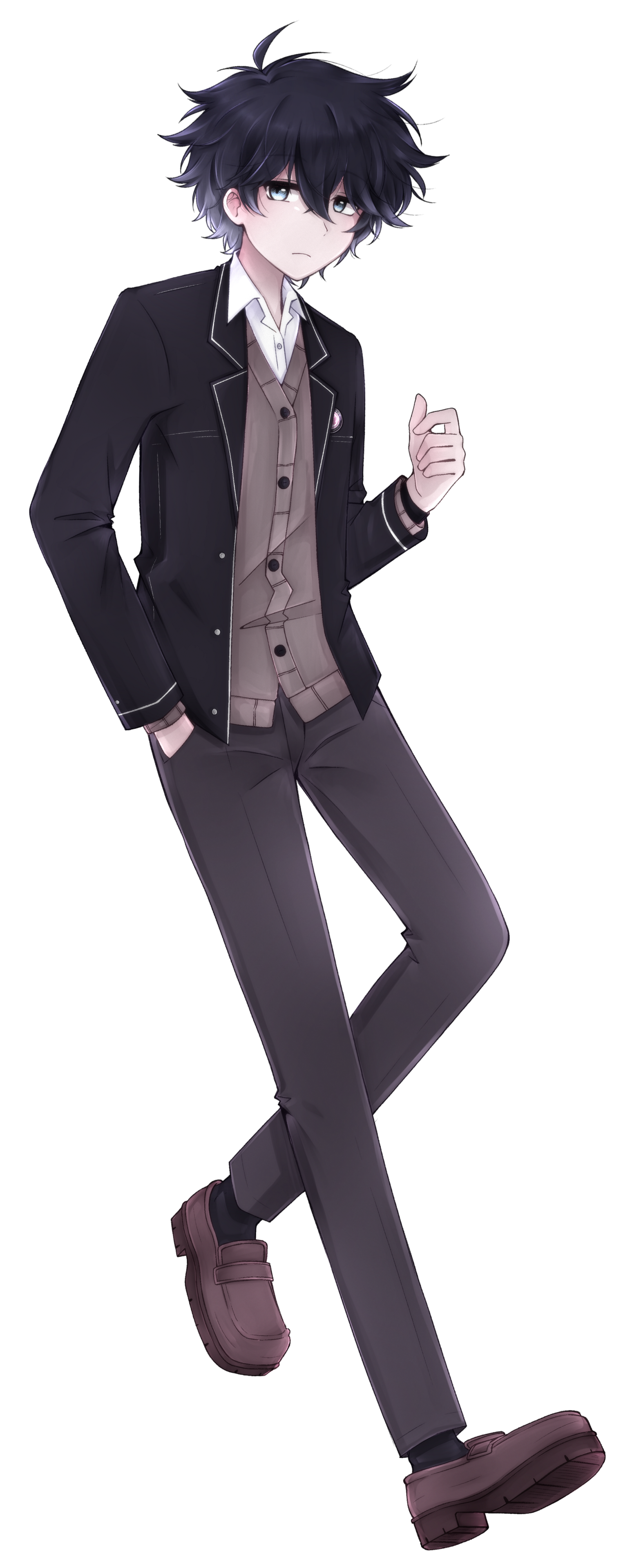 Shou est un jeune homme au regard bleu clair, souvent perdu dans ses pensées avec un air calme et détaché. Ses cheveux noirs, un peu décoiffés, retombent naturellement sur son front, ce qui accentue son allure nonchalante et rêveuse.Son style vestimentaire est élégant et soigneusement choisi, contrastant avec son attitude décontractée. Il privilégie les chemises et les pantalons ajustés mais aussi des cardigans aux lignes simples. C'est un look naturellement chic et propre qui montre qu'il prend soin de lui, même sous ses airs désintéressés.